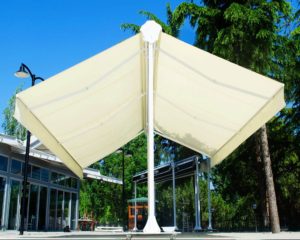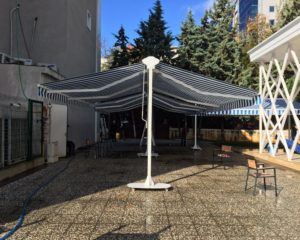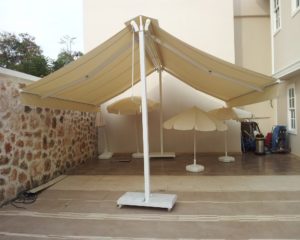 Çift açılır tente göründüğü gibi manuel olur camii meydan teras kat ve dükkan bahçe ve kapılarında kullanırmak için uygundur.